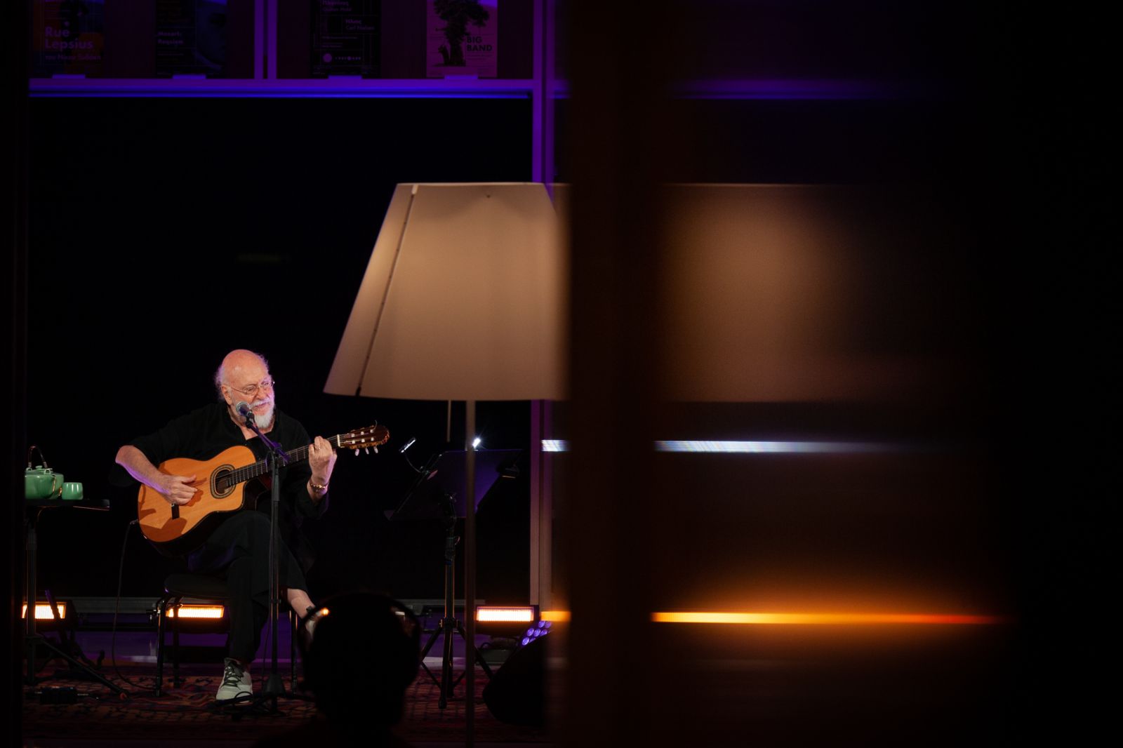 Με μια σχετικη αμηχανία επειδή, όπως είπε κι ίδιος, δεν συνηθιζε να παίζει χωρίς ακροατές τραγούδισε και είπε τις απολαυστικές του ιστορίες